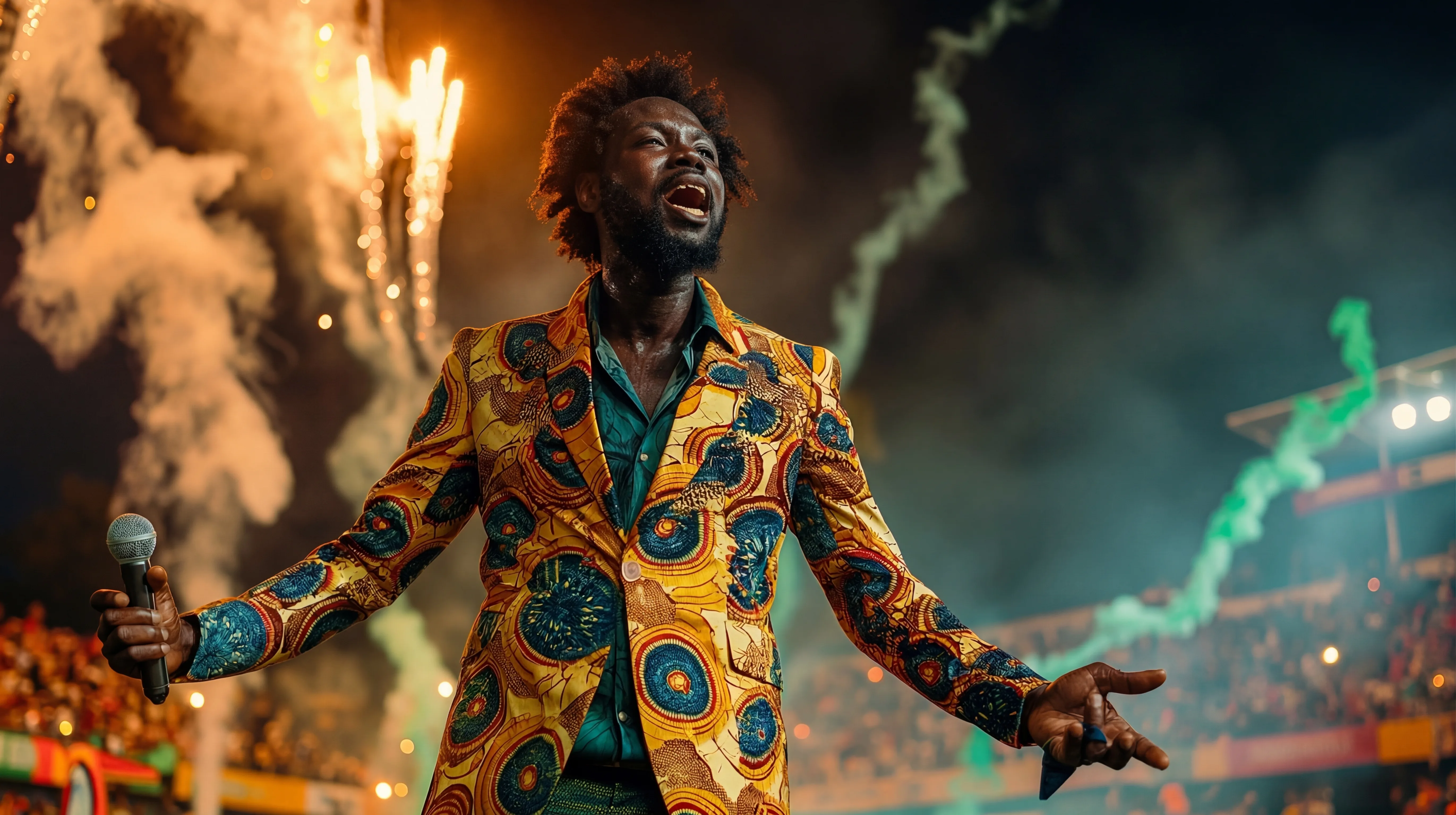 A gigantic packed stadium under the sparkling night sky. Spotlight beams dancing. Flames on both sides of a grand centre stage. The crowd already roaring — chanting "I Got the Pawa" before anyone has appeared.
